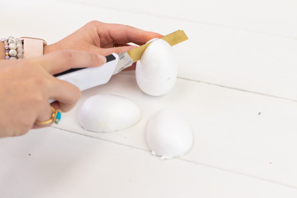 - Use a craft knife to cut each styrofoam egg in half. The amount you will need will depend on the size of your styrofoam cone. I used a 12"x 5" cone and I needed 16 egg halves.