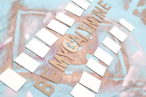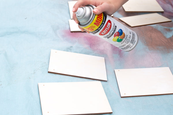 - Lay the wood rectangles, letters and hearts on the tarp to prepare to spray.