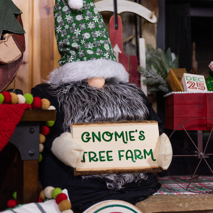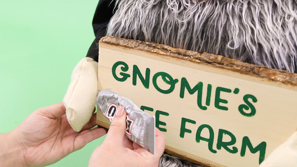 - Attach the sign to the front of the gnome with E6000. Glue the gnome’s hands into position so that he appears to be holding it. Allow glue to dry.