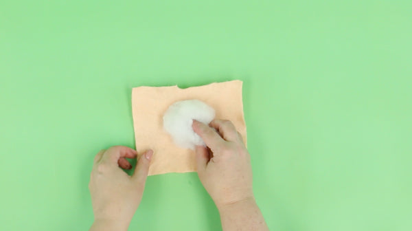 - Cut a small rectangular piece of skin tone felt. Place a small amount of pillow stuffing in the center and then gather the edges of the felt. This will create the nose of the gnome. Use a rubber band to secure the edges of the felt. Glue the nose onto the gnome at the top of the felt. Allow glue to dry.