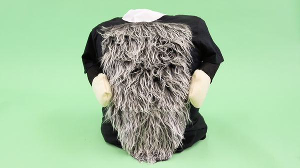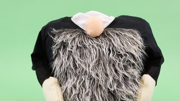 - Glue gray fake fur to the front of the shirt starting at the neck. Trim fake fur into beard shape if desired.