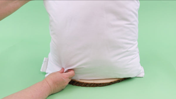 - Turn the pillow vertically and glue the bottom edge of the pillow to the large wooden round using E6000. Allow to dry.