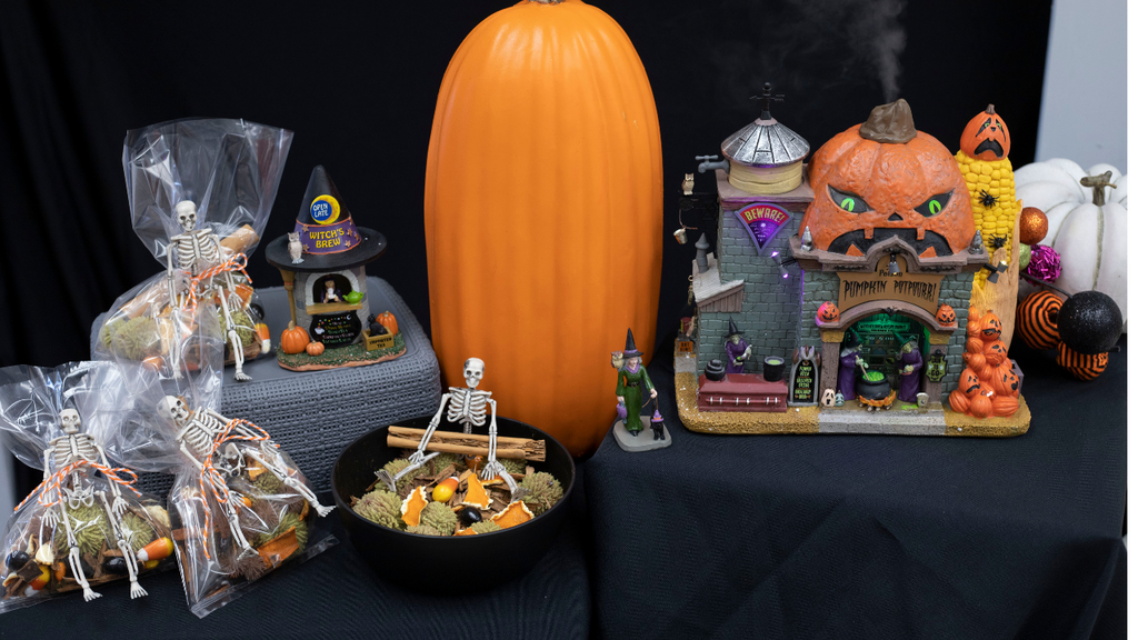 It's Halloween time and I am pulling out my favorite pieces to create easy DIY Lemax Villages. Today I am creating a homemade potpourri recipe that your friends can take home. This is built around the show stopping Pumpkin Potpourri House that actually smokes!!!