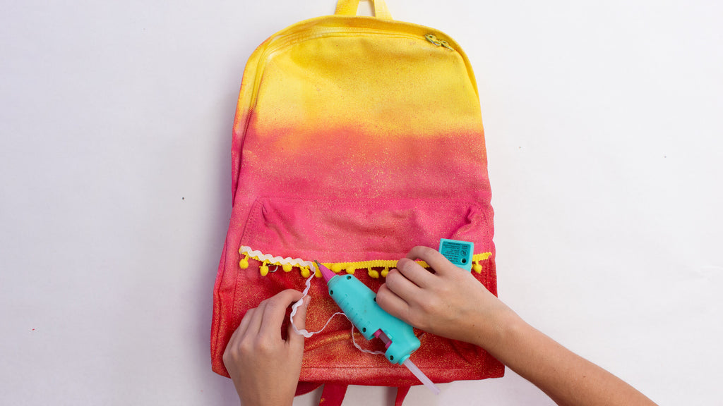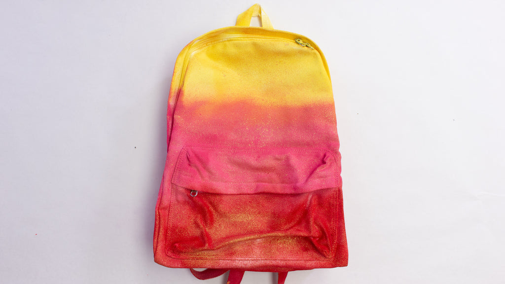 - Once the whole front is covered, spray a light dusting of the gold glitter fabric spray paint all over the backpack. Let the backpack dry for 30 minutes.