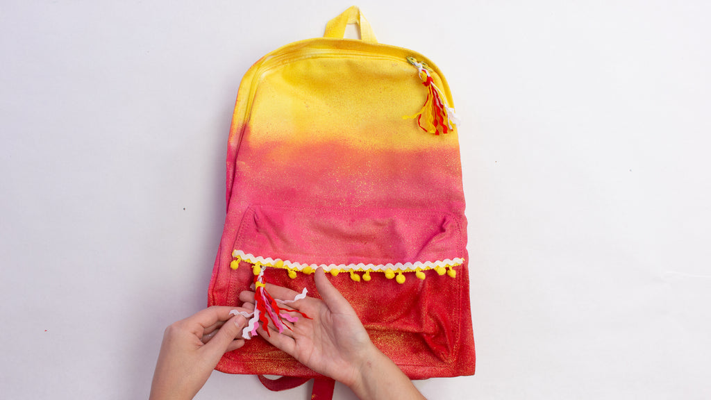 - If you want to add a little more fun to the bag, glue on some rick rack and trim. I also used my trim and rick rack to create tassels for the zippers. If you are planning on machine washing it, be sure to use a fabric glue. If you are just going to spot clean you can use hot glue.