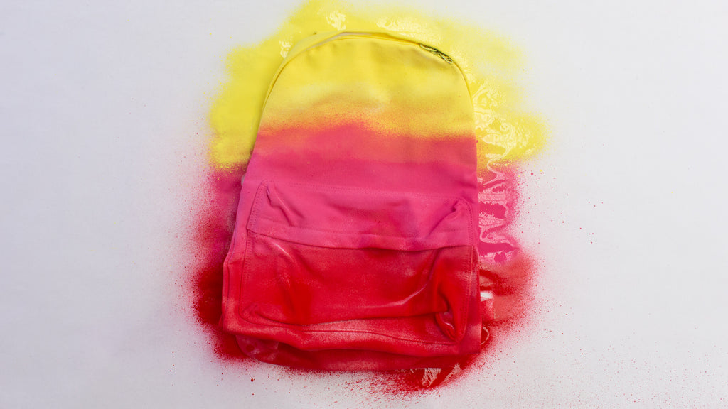- Next take the pink and spray the middle third of the backpack. Start the spray by overlapping the red section. These will blend the colors and create a new color to connect them.
