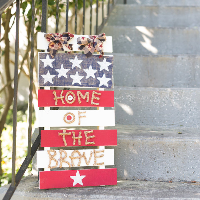 Grab a pallet, paint, rope, glue, stencils and burlap to make this patriotic front porch decor that is perfect for all Summer! Beacon Adhesive Power-Tac is the glue that holds it all together! Scroll down for the supply list and more photos!