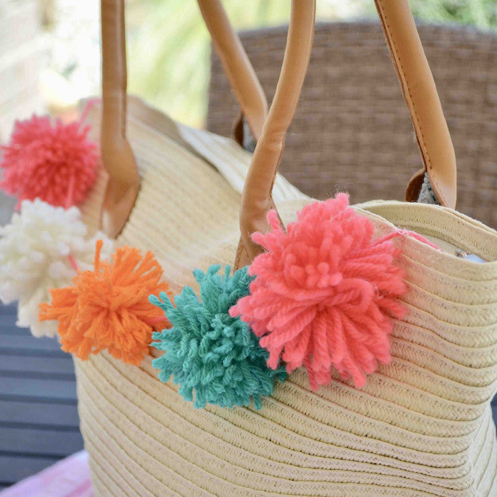 Making DIY pom poms and tassels are beyond easy and inexpensive. All you need is some yarn and a pair of scissors! I love the idea of adding these to beach bags to give it a little bit of a pop, and that is exactly what I did! I wanted to show you how you can make both the pom poms and the tassels, AND how they both would look on the same bag. You can get really creative with this, and add them all over the bag, or any way you like.
