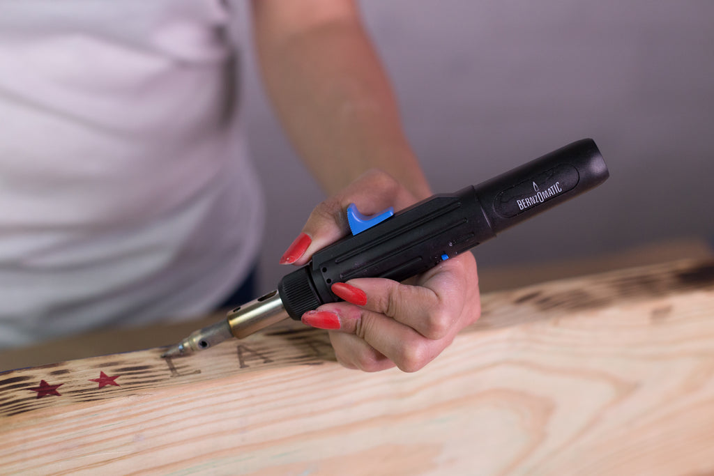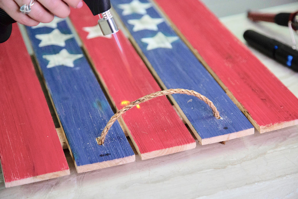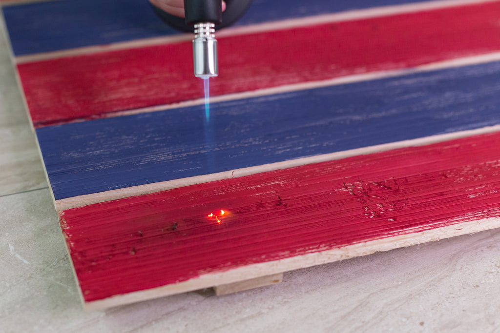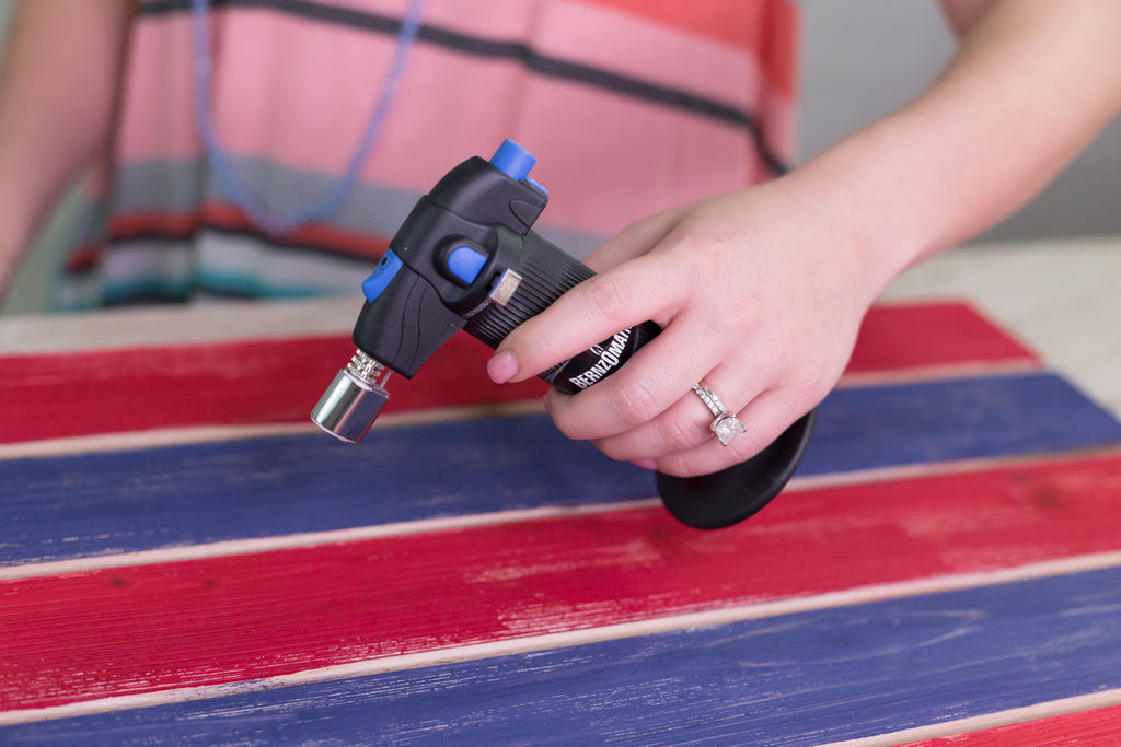 - Glide the Bernzomatic across the top of the board to highlight the knots and imperfections in the wood. Glide across the stars to give the white a vintage design. Make sure to glide across the edges of the wood to highlight the grains.