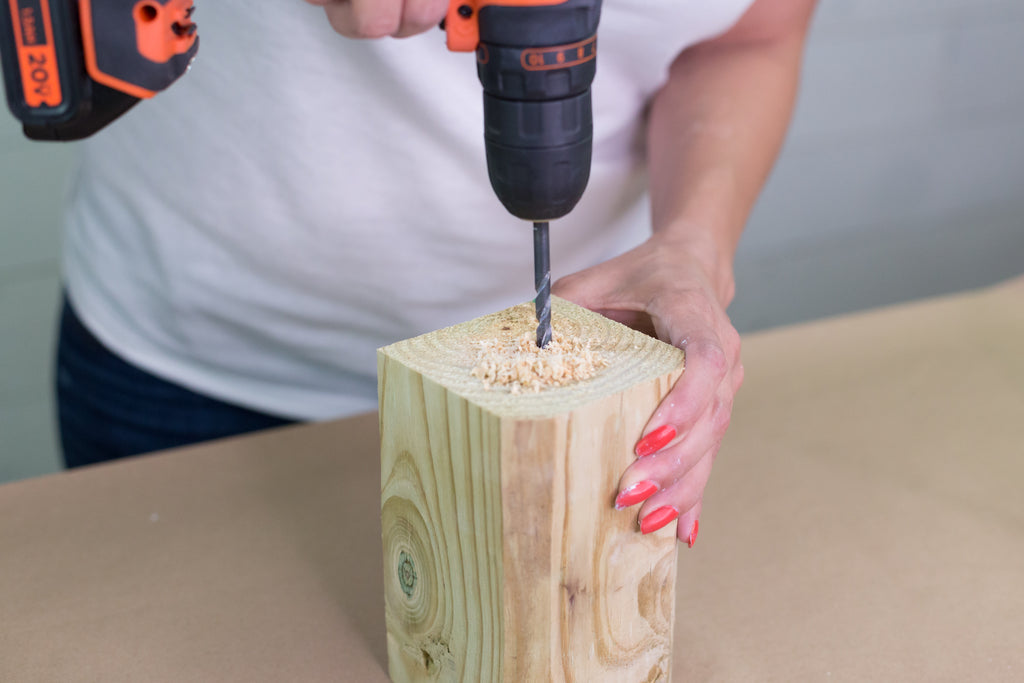 - Drill 4 holes in the top of the lumber. Drill the holes about 1 inch deep.