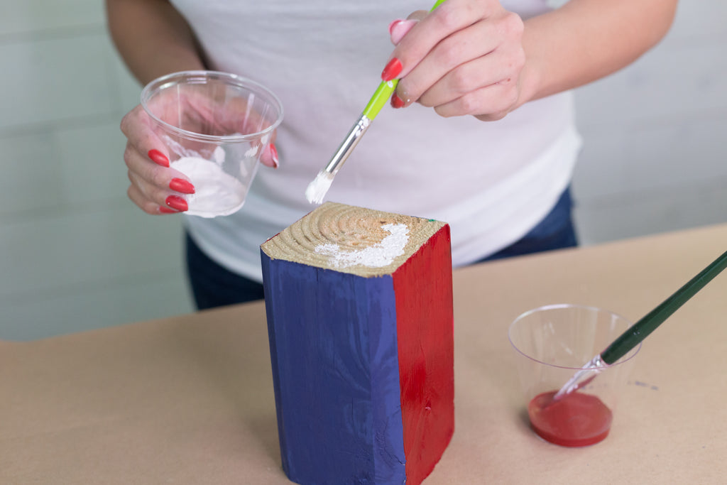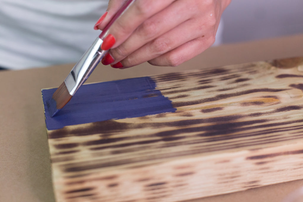 - Use the milk paint to design a flag on the surface of the wood. We selected milk paint because it stains the wood and allows the beautiful burn patterns to shine through.