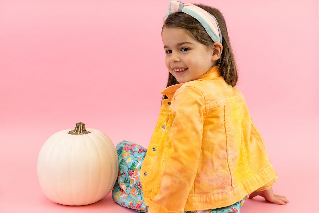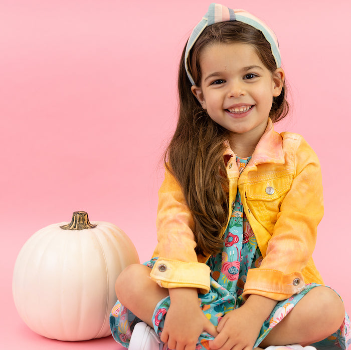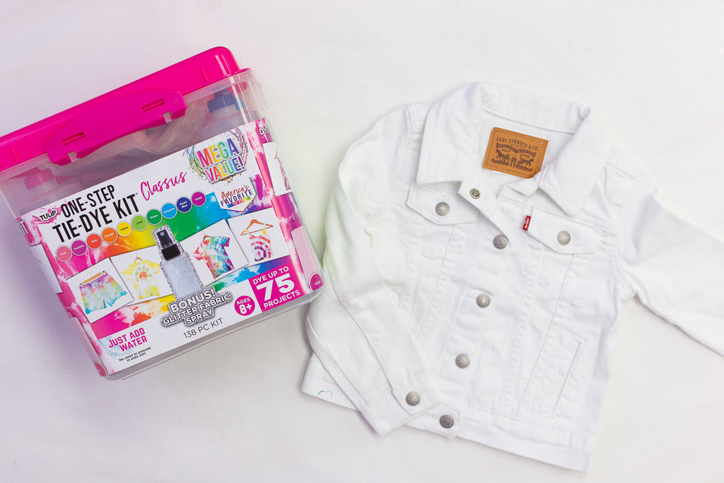 Fall is almost here and my daughter Lily has been asking for another jean jacket. It was the perfect opportunity for me to try tie-dying jean material for the first time. I used the Tulip One Step Tie-Dye Mega Value Kit. There is enough bottles to tie dye multiple projects and there is a bonus fabric glitter spray. It was the perfect pop of sparkle to make my daughter obsessed with this jean jacket! Check out this easy project!