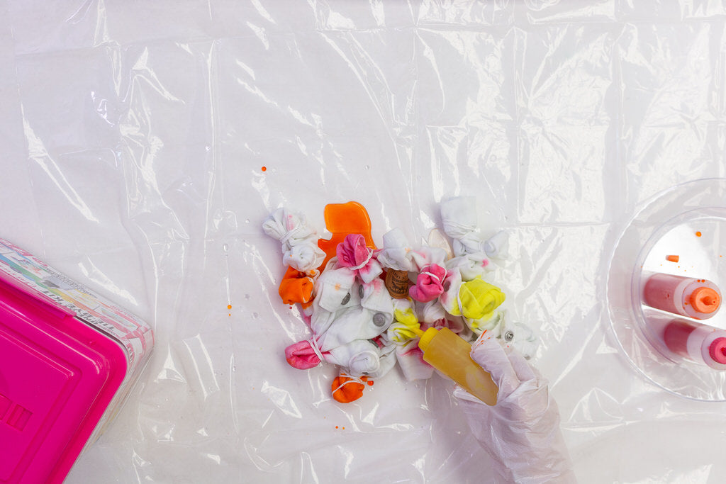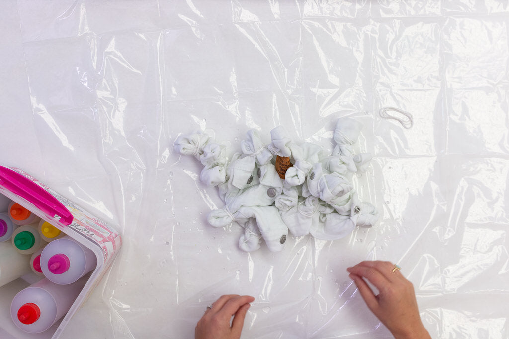 - When you are finished applying dye, wrap the jacket in the plastic and use rubber bands to secure the bundle so no dye leaks out.