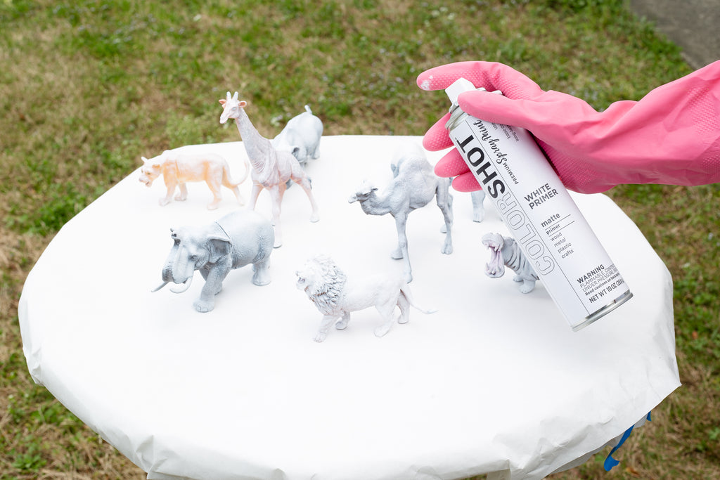 - Spray paint your animals with primer and let dry.