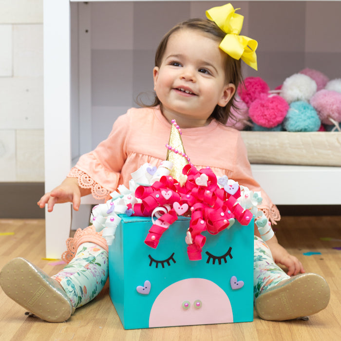 - Cut a half circle from pink cardstock for the unicorn snout and glue to the front of the box.