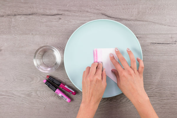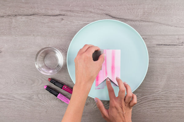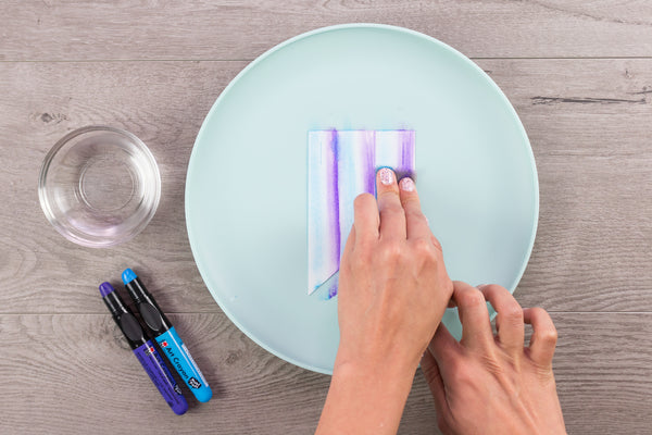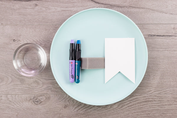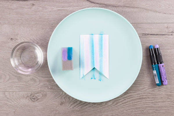 - Lightly dampen a sponge with water. Choose two Art Crayon colors. Draw side by side lines onto the wet sponge with the dry crayon.