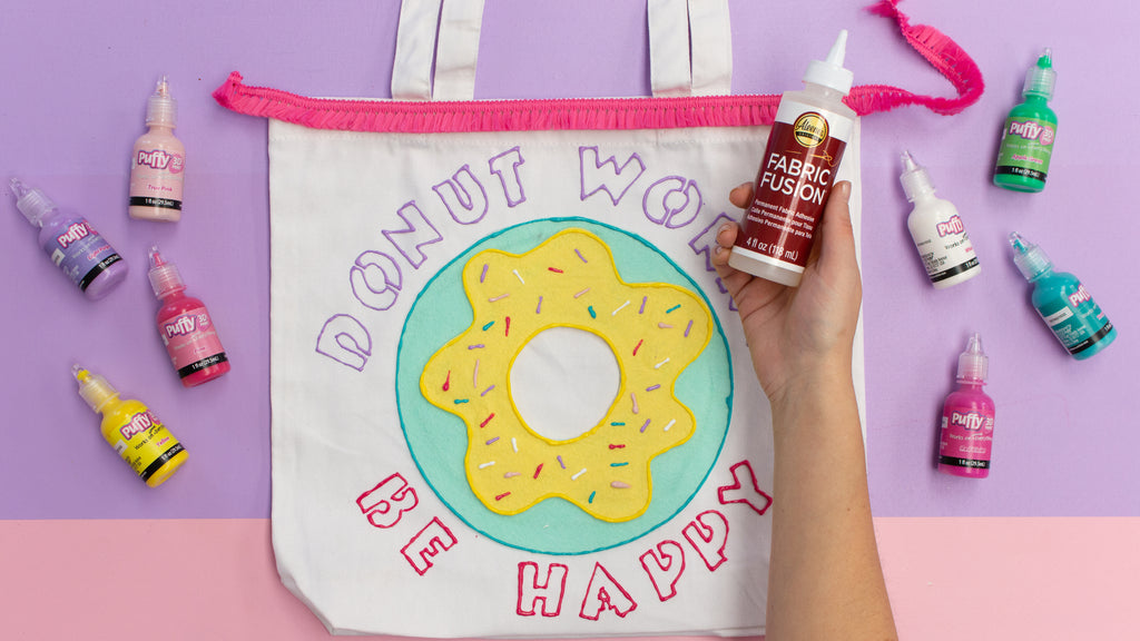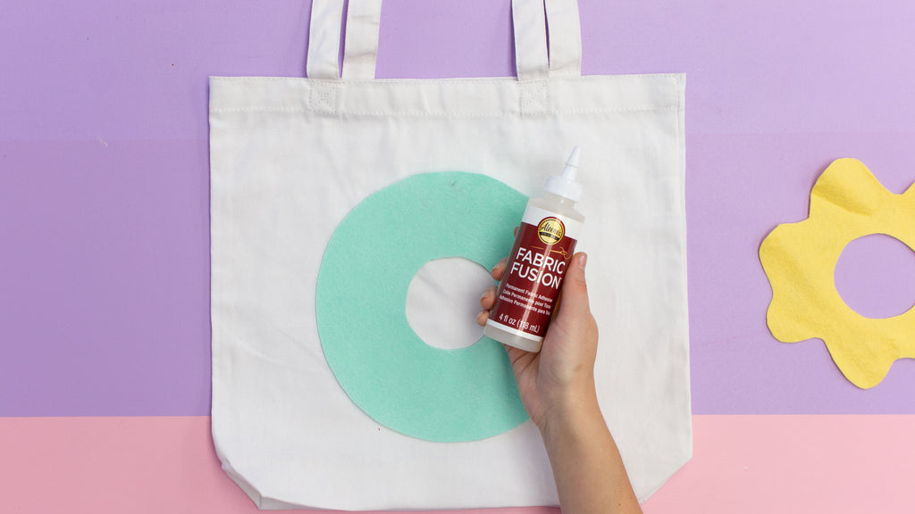 - Use the Fabric Fusion to glue the donut and the frosting to the tote bag.