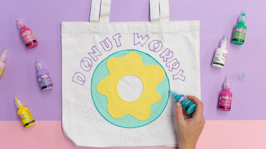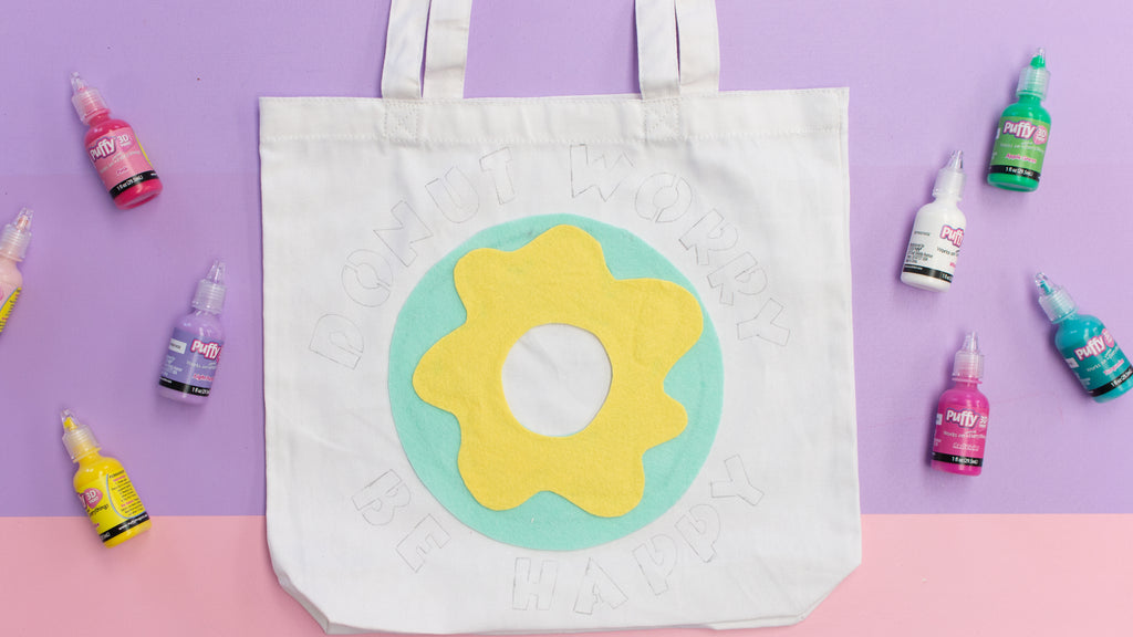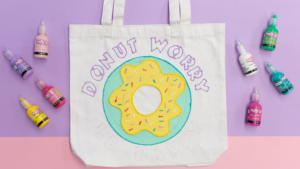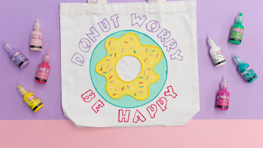 Donut Worry Be Happy! That sounds like a good motto these days! I thought why not put it on a tote! This fun and easy tutorial is using 3D Puffy Paint and is great for all ages! I have grown up using puffy paint and I continue to use in crafts for kids and adults. I love how it brings dimensions to the simplest projects!