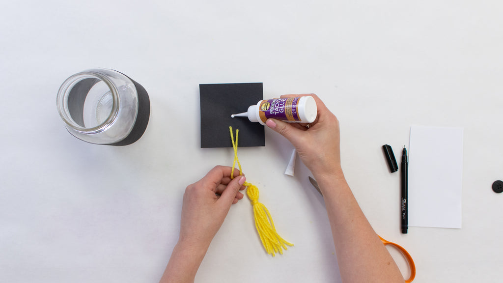 - Glue the ends of the tassel to the top of the graduation hat (jar lid). Place another dot of glue on top of the jar ends and adhere a button.