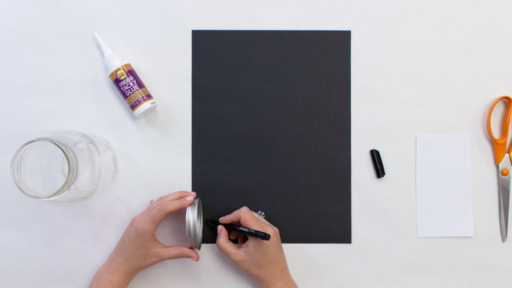 - Remove the lid from the jar. Cut a piece of black paper to fit around the rim of the lid. Use the Aleene's Turbo Tacky Glue to adhere the paper around the lid.