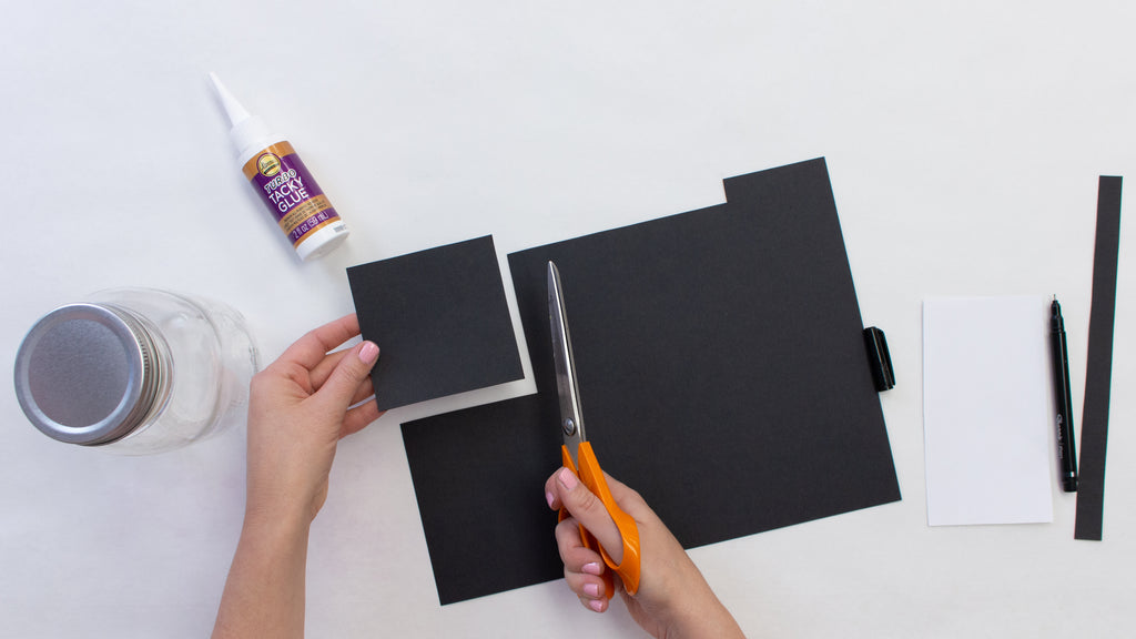 - Next cut a 3.5"x 3.5" square from the black paper. Glue to the top of the jar lid. You might need to adjust based on the size of your jar.