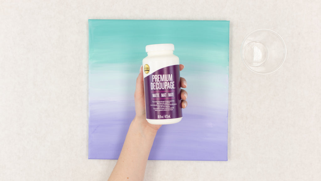 - Once the canvas is dry, pour Aleene’s Premium Decoupage in Matte in a plastic cup and use the foam brush to apply a light layer of decoupage on the canvas.