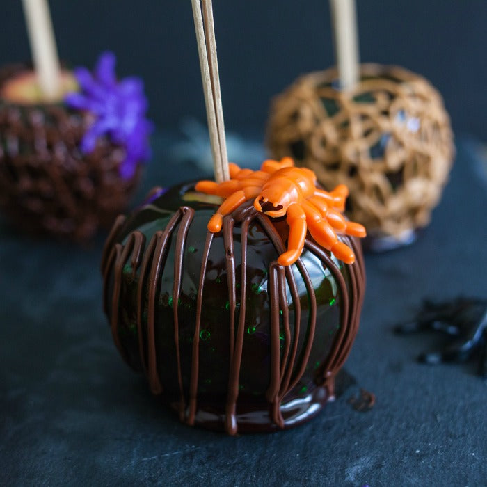 5. When candy apple hardens, you can continue decorating or eat it as is. I like to add candy melts and nuts to the candy apples. Adding Halloween spiders to the decoration makes it spooky and fun.
