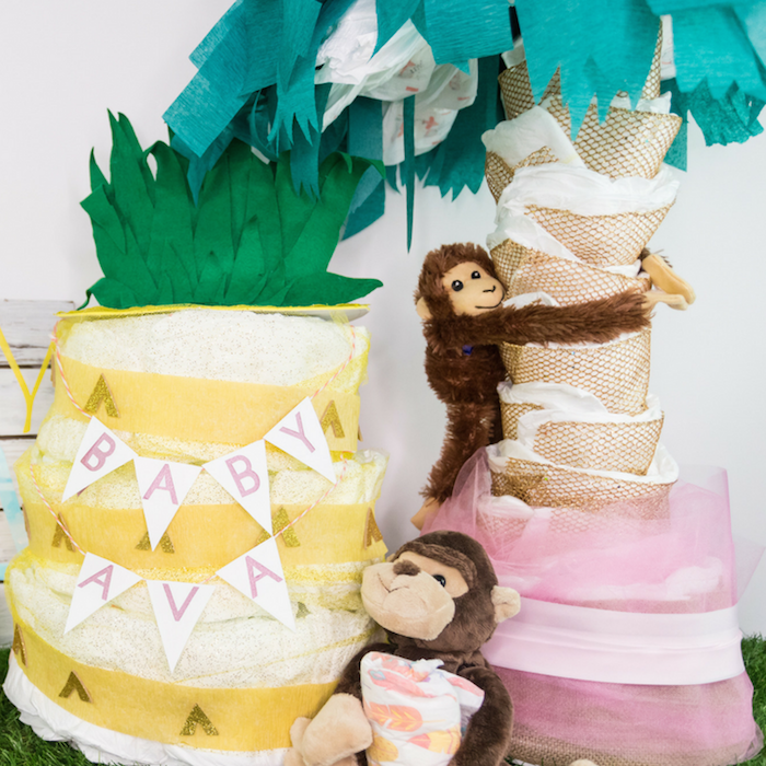 Diaper cakes don't always have to be traditional! Tap into your tropical side for an out of the box baby shower diaper cake with a pineapple and palm tree diaper display! Create the perfect shower centerpiece with Beacon Adhesives line of craft glues!
