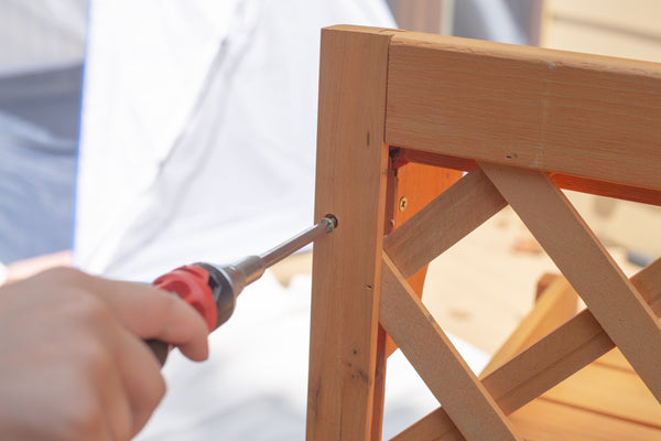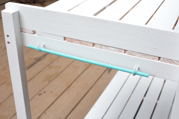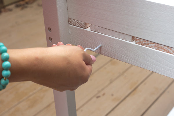 - Screw two screw hooks on each side of the table to hold the dowels.