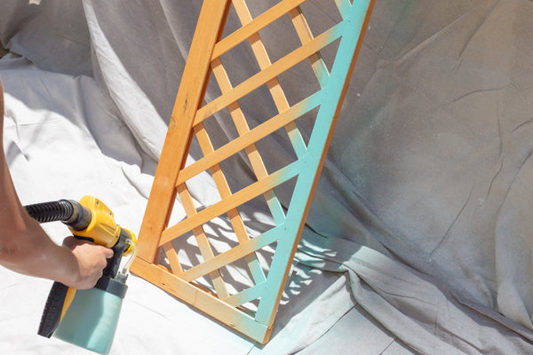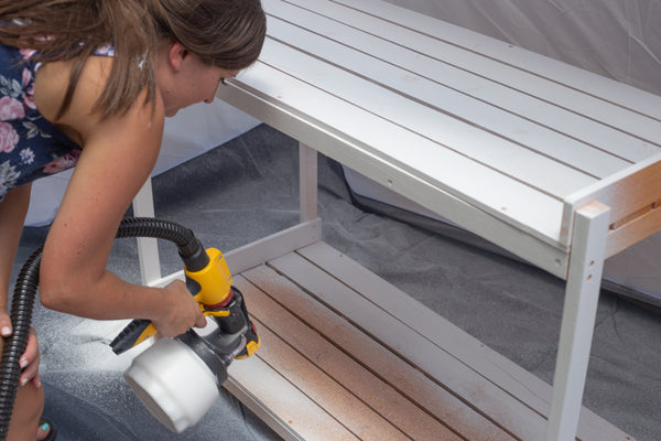 - Hold the sprayer about 6-8 inches from the project. I started by spraying the table and while that dried in the tent I sprayed the lattice and two dowels.