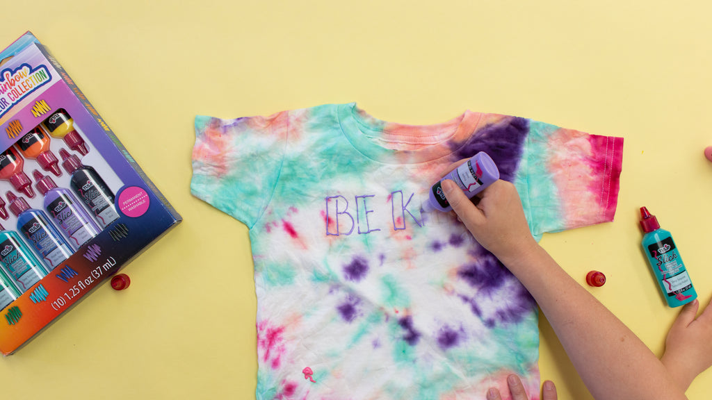 - Once the shirt is washed and dry it's time add a fun and inspirational message. Parents if you kids are too young you can ask them what message they want and you can draw it on with a pencil and then trace it with the Tulip Slick Dimensional Fabric Paints. We chose the message "Be Kind Love Everyone"