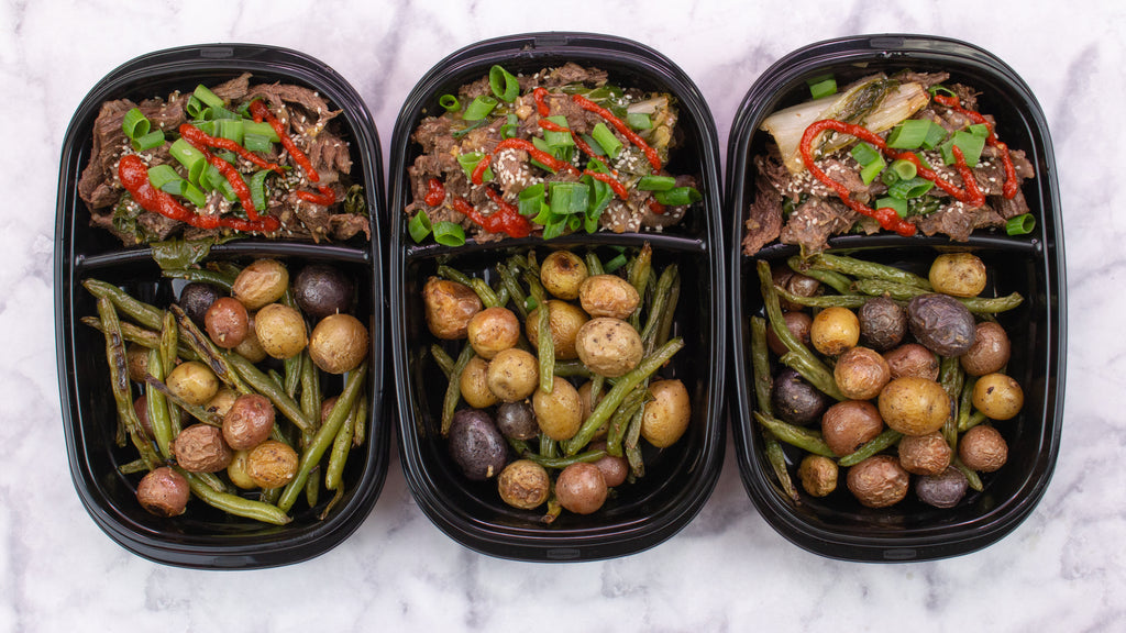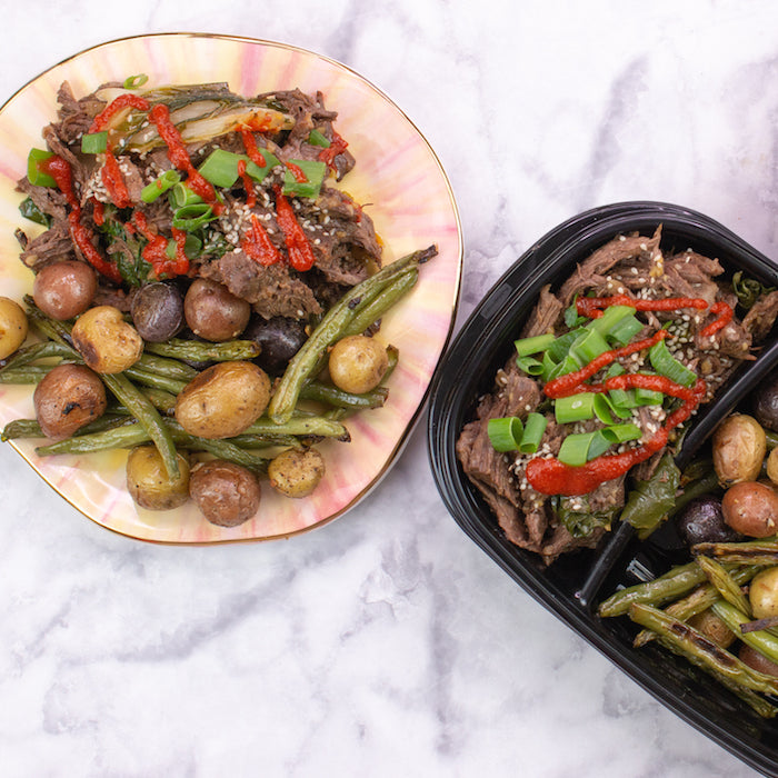- Release steam and take out beef to shred. Add bok choy to pot and top with shredded beef. Replace lid and allow it to sit for 10 mins. Serve in meal prep and garnish with sesame seeds, scallions, and siracha.