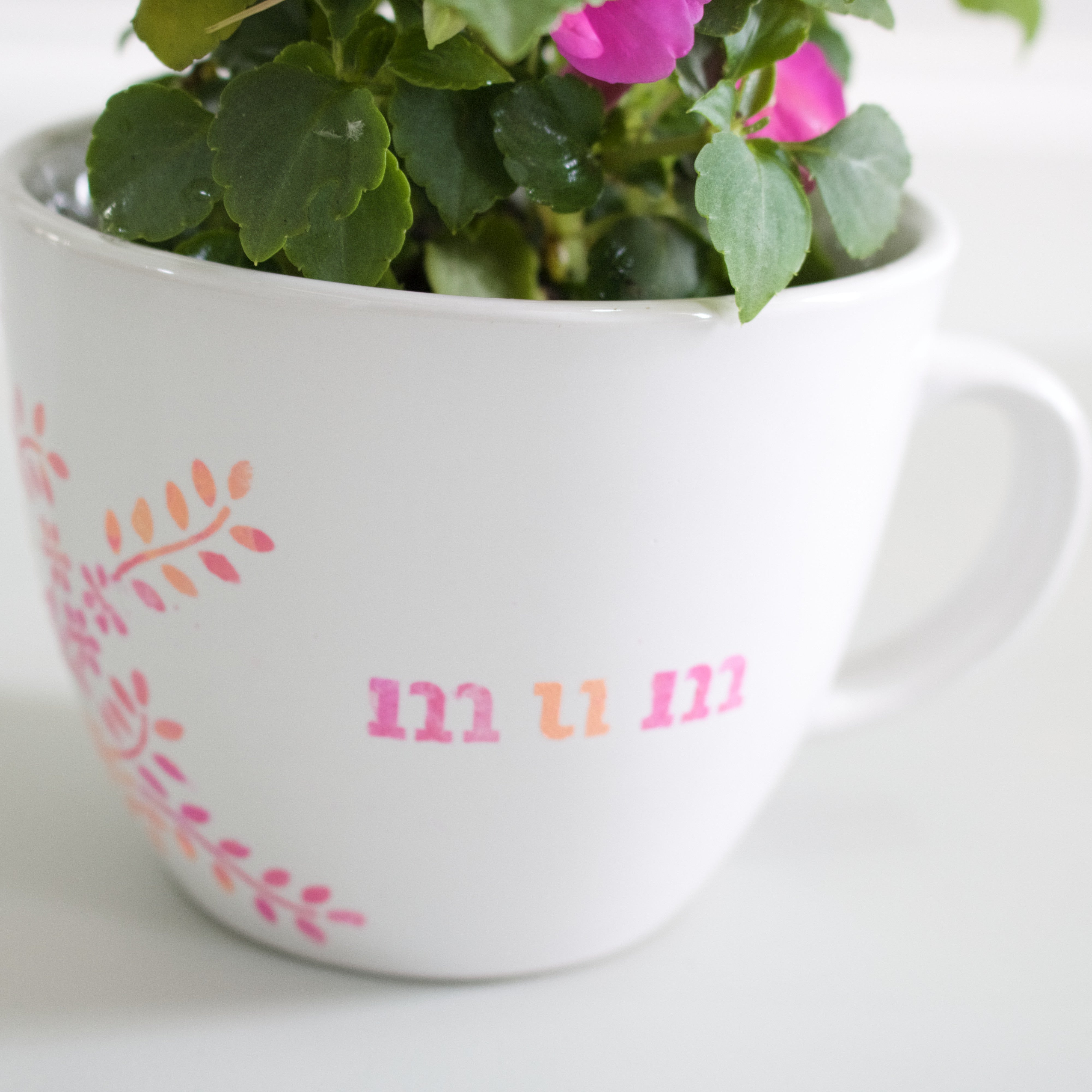 Now that your mug is personalized, add a pretty flower and give it as a gift for Mother’s Day! You can also fill it candy (or your mom’s favorite things) or use it as a centerpiece for a Mother’s Day Brunch!
