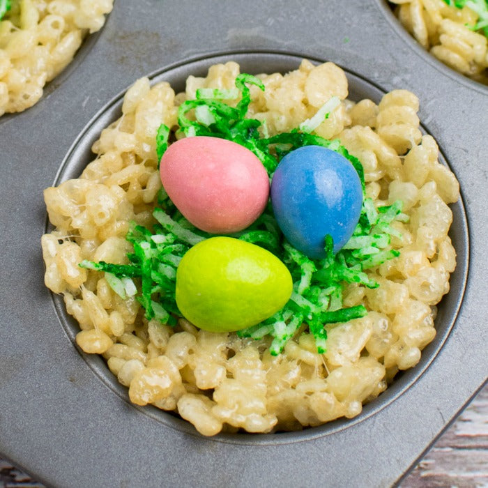 - Spoon mixture into each of the muffin cups until almost full. Use hands to press rice crispies mixture into each of the muffin cups and make a small indention in the middle of the "nest". Top with coconut flakes and pastel colored candies.