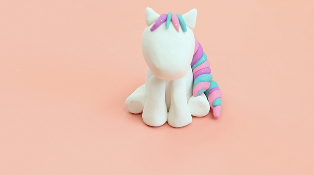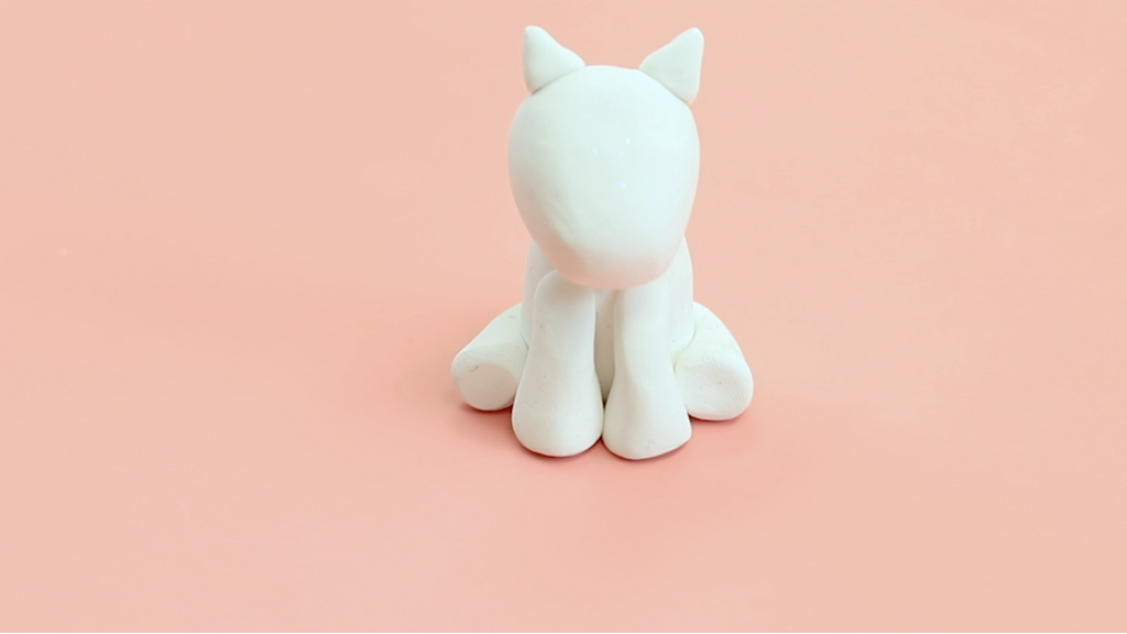 - Next, form a smooth rectangular shape out of the white clay. Add smaller rectangular pieces to the side to form the body and limbs of the unicorn.