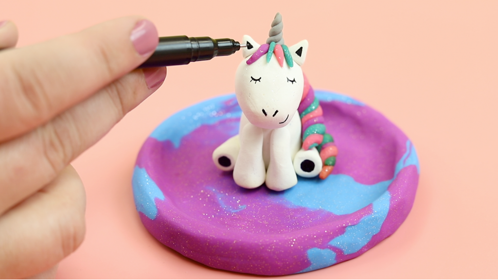 - Once your unicorn has cooled after baking, add details to your unicorn using the black pen.
