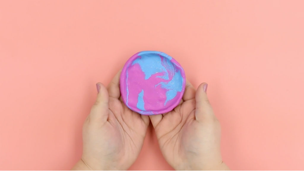 - Next, mix the blue and violet Sculpey III balls together to make one marbled circle with a short rim. Set aside for now.