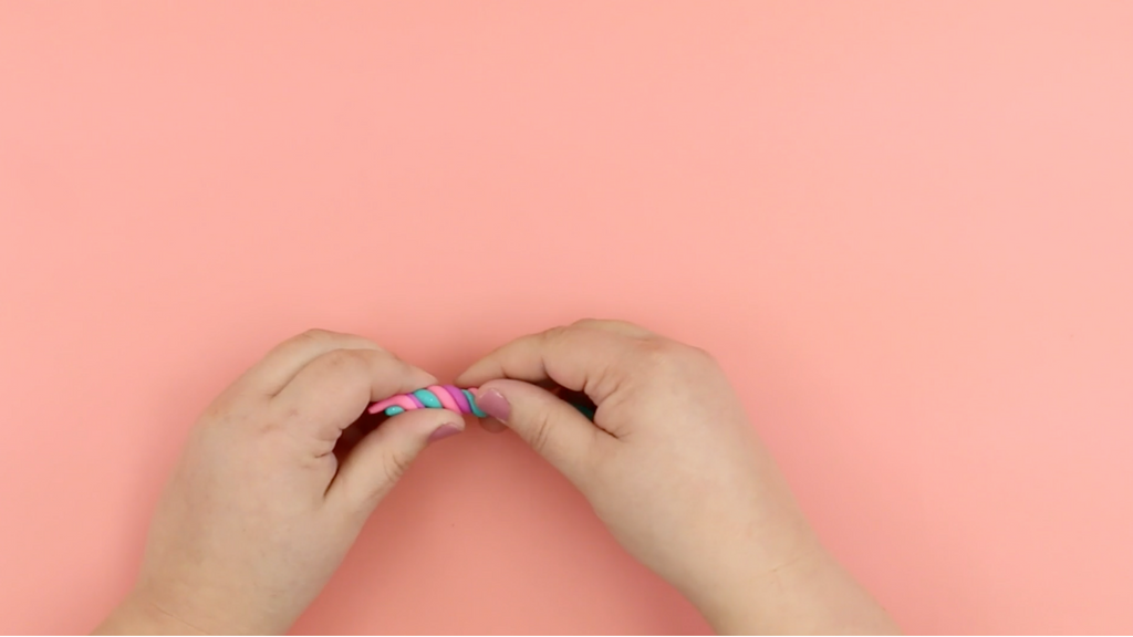 - Take a long and narrow portion of the teal, violet, and pink clay each.