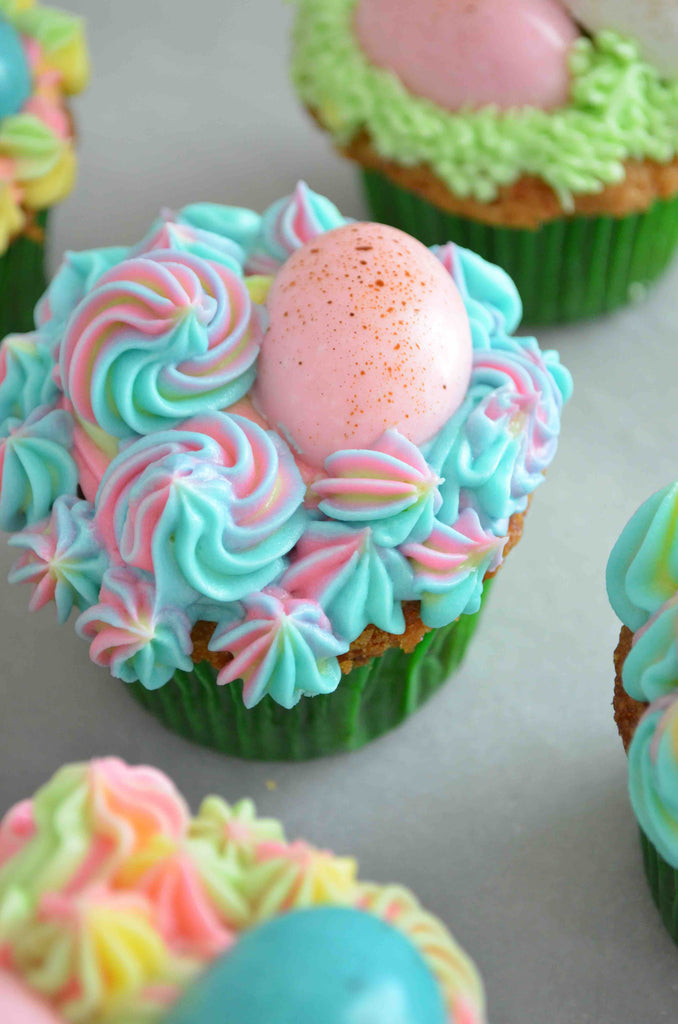 8. Frost the cupcakes as desired and add the speckled eggs on the top.