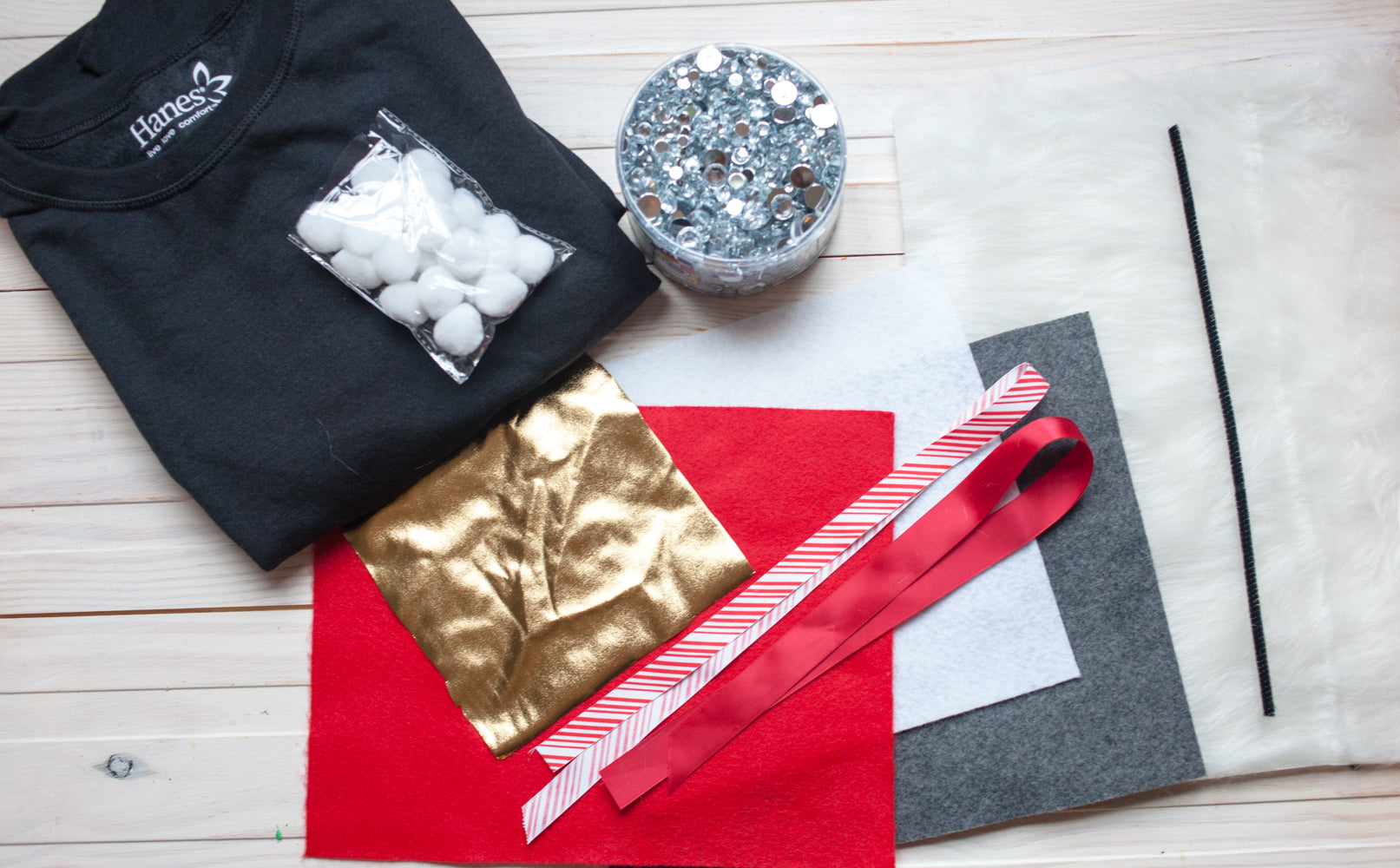 3. Once the snowman's features are done, cut out white triangles to make snow covered pine trees. Cut the black pipe cleaner to make tree trunks. Cut the red, gray and gold felt/fabric in rectangles to make presents. Create a Santa hat using a red triangle felt and white pom at the top of the hat. Tie a bow using the holiday ribbons. Now scatter the acrylic jewelry like it is shimmery snow flakes. Hot glue everything but the snowman on the sweater.