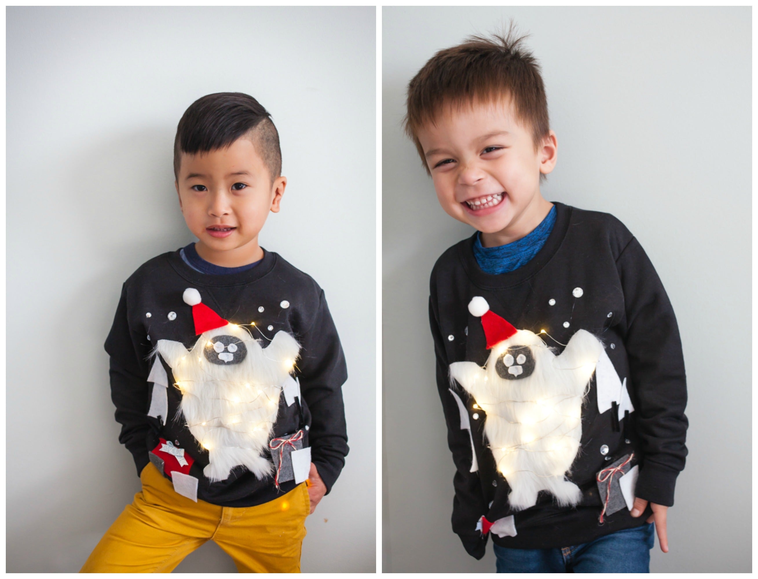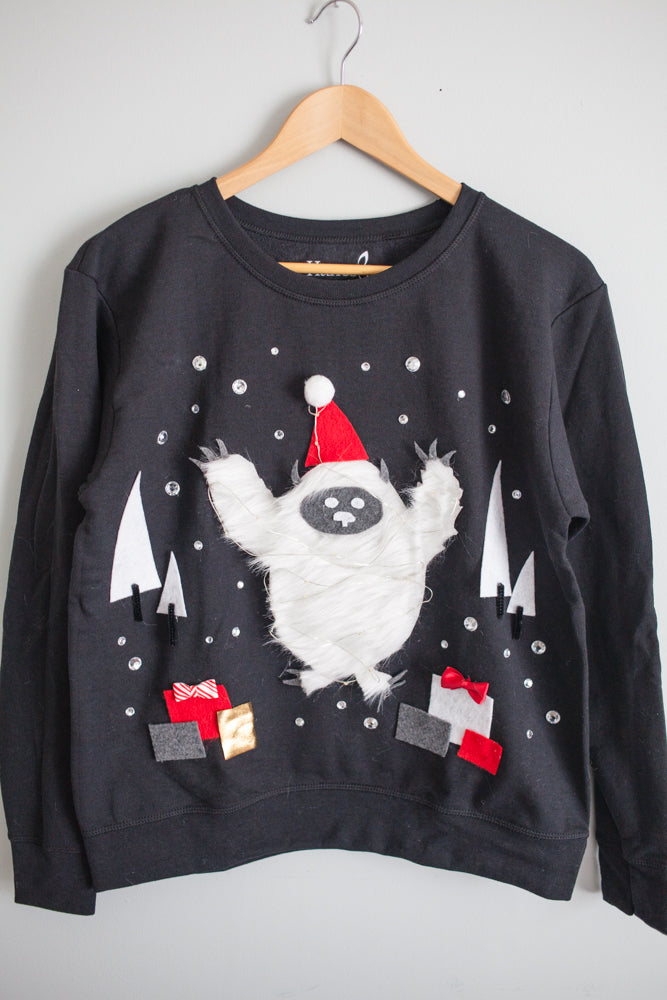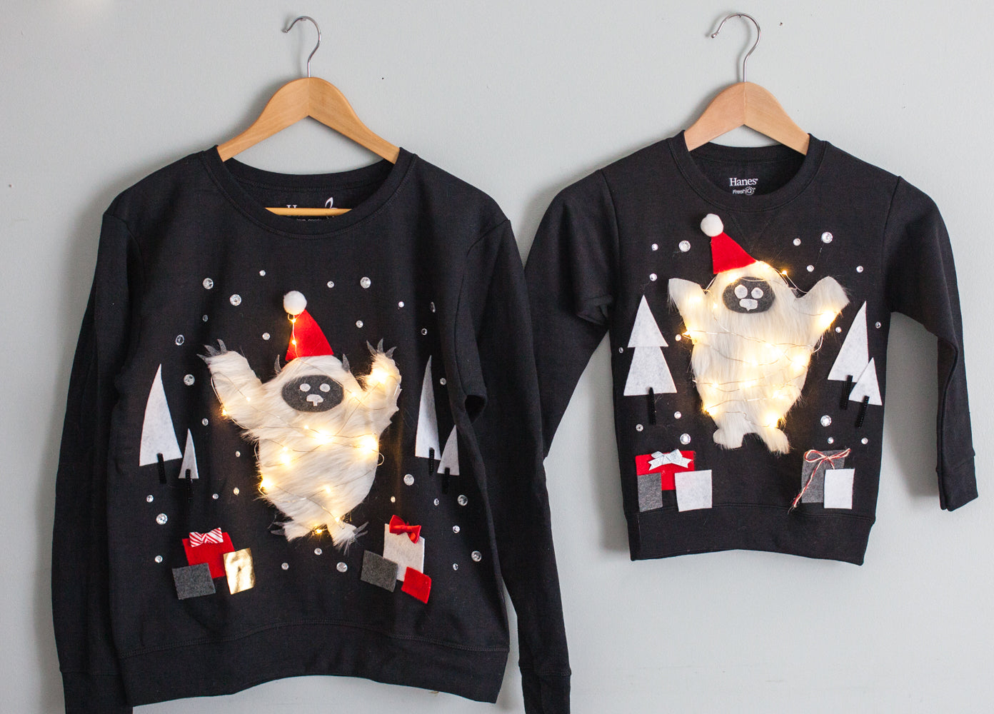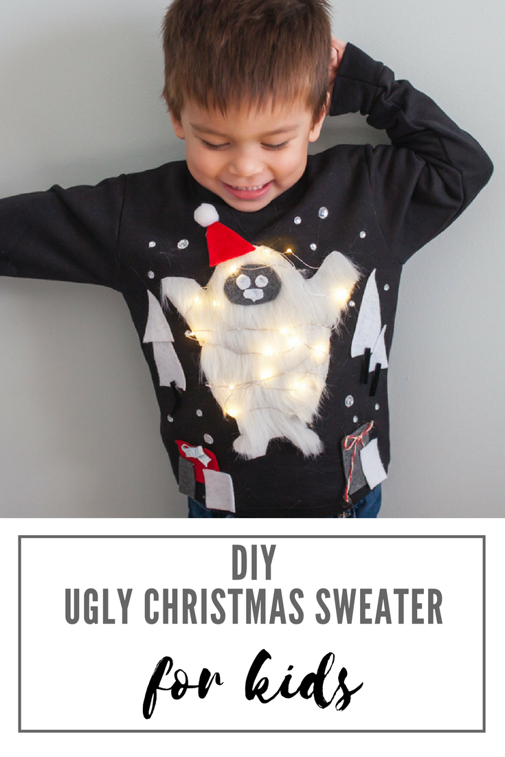 This year's Ugly Christmas Sweater is this fun and clumsy snowman sweater. The snowman is all tangled up in Christmas lights! He's funnier than he is scary. Kids will love this project and they won't want to take the sweater off. The fairy lights adds to the festivity. So get the party started already!