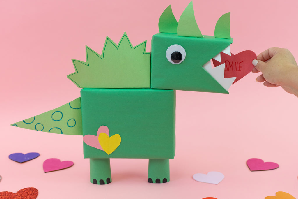- The small box is the dino's head. Cut out teeth from white construction paper and glue into the mouth.