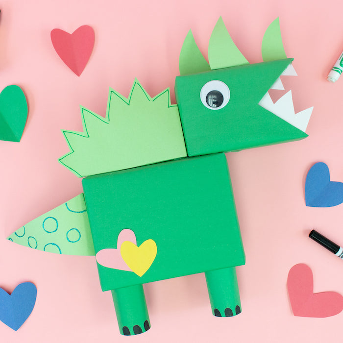- Cut out triangles or wave shapes and glue them to the top of the box to make dino horns.